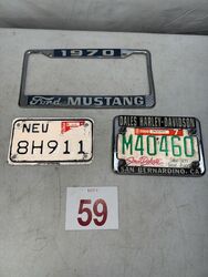 Harley Davidson bracket Ford Mustang bracket and two motorcycle license plates. See photos sold as is.