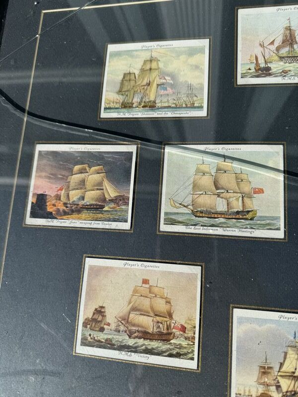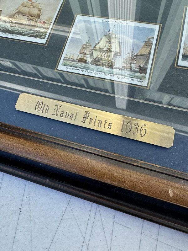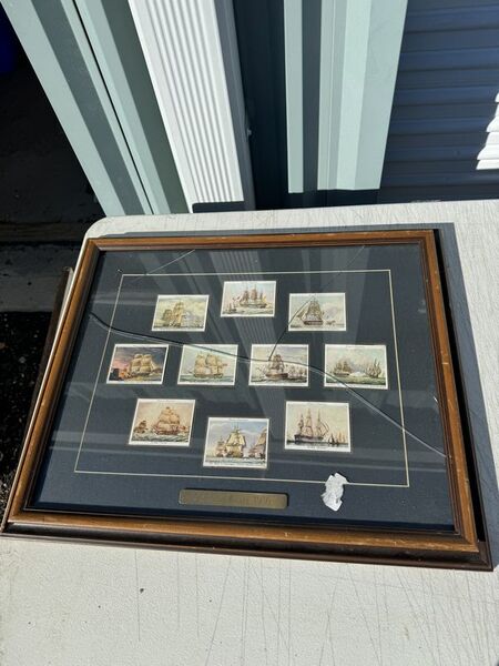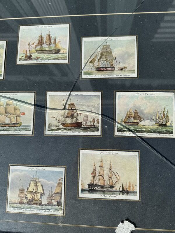 Glass is cracked cards don’t seem to have damage. Old naval prints 1936 sold as is