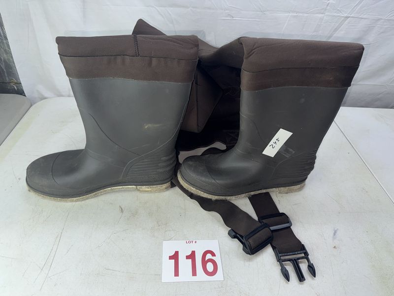 Shakespeare ice fishing pole and Cabela’s waders size 8 see photos sold as is