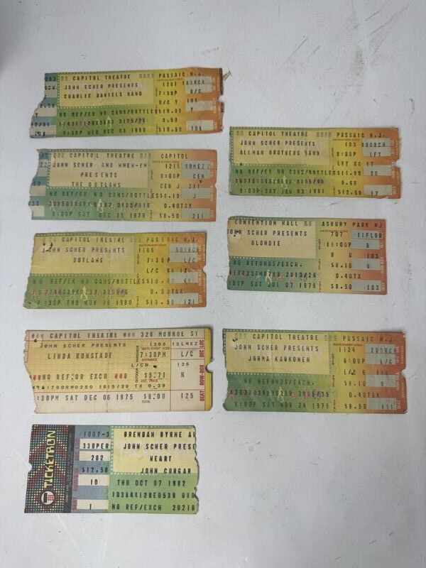 Ticket stub lot Charlie Daniels band 1980 the outlaws 1979 the outlaws 1980 Linda Ronstadt 1975 heart and John cougar Mellencamp 1982 the Allman Brothers, 1981 Blondie 1979 and Jorma Kaukonen 1979 sold as is