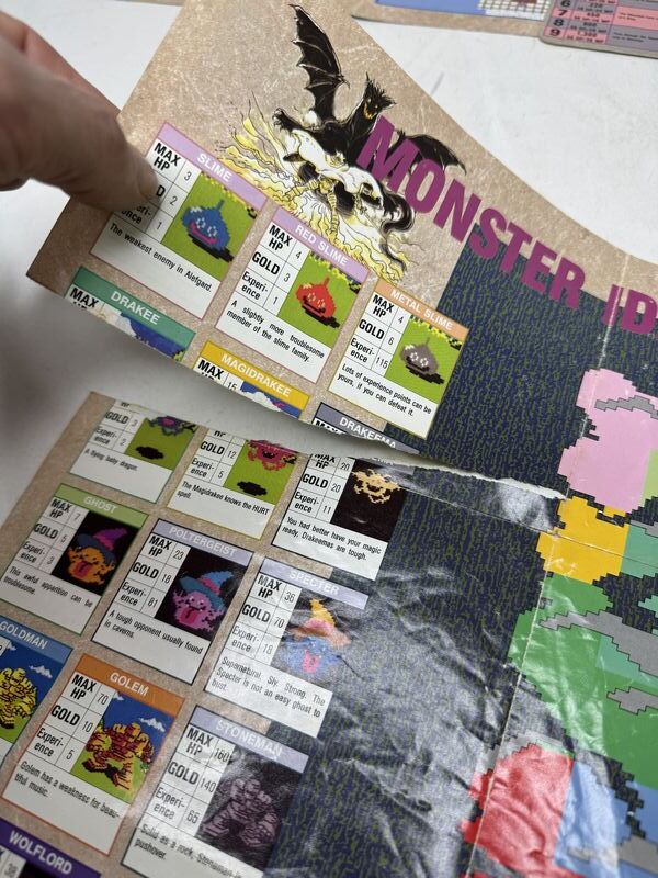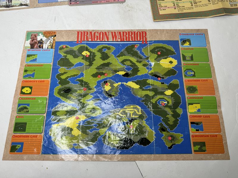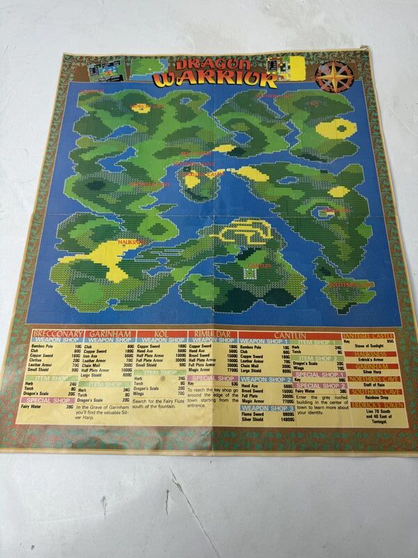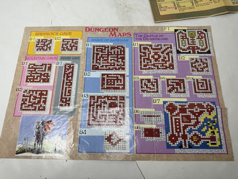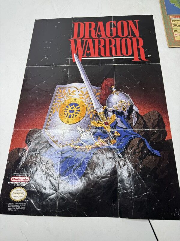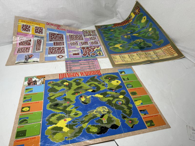 Dragon Warrior map, poster lot dungeon maps has some tears. The dragon warrior map also has a tear. The dragon warrior map poster has tape on the corners sold as is.