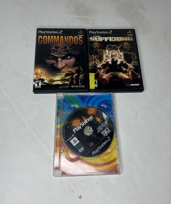 PlayStation 2 game lot the suffering complete with game commandos men of courage booklet case, no game, PlayStation issue 87 demo disk sold as is