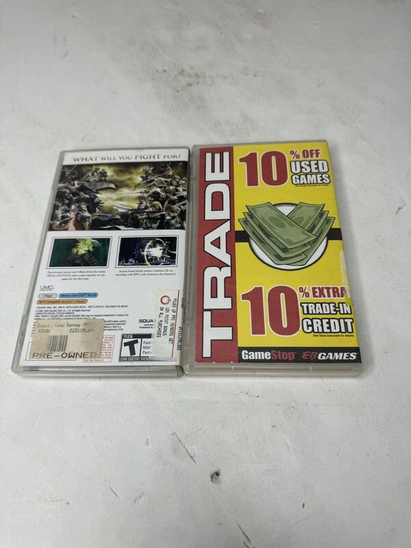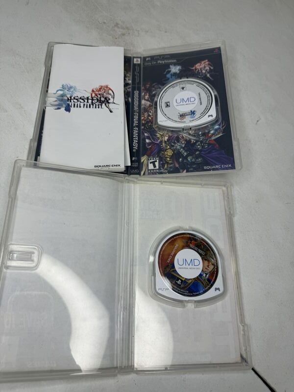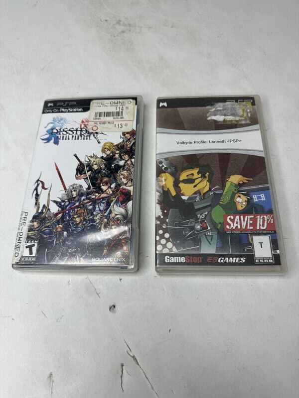 PS P Dissidia, Final Fantasy, with booklet, case clips broken, won’t close, completely PSP Valkyrie profile missing booklet. Untested sold as is.