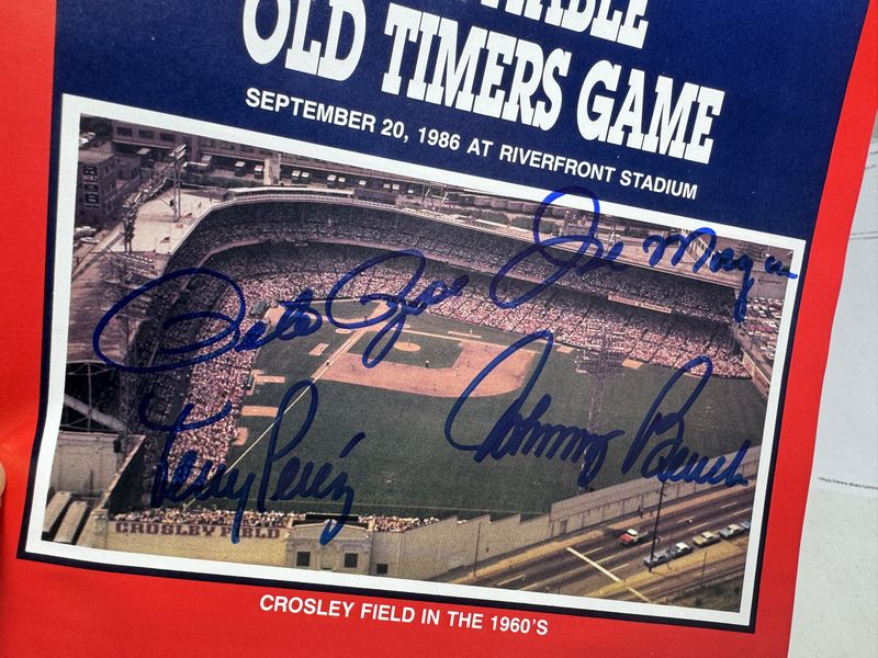 Pete, Rose, Tony, Perez, Johnny bench, Joe Morgan, autograph on a 1986 old timers game handout, no rips, or tears sold as is
