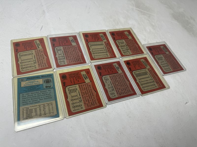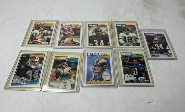 All cards are 1987, except one ones 1989. There’s Joe Montana Jerry Rice, Walter Payton, Jim Kelly Herschel Walker, Steve Largent, jim, Everitt, John Elway sold, as is