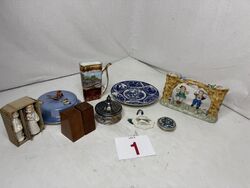 Limoges trinket box, decanters, salt and pepper shakers, jar lids and figural bottle toppers. See photos sold as is.