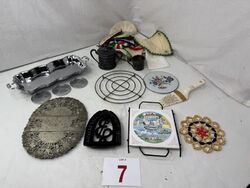 Silver plate, hot plates, trivets, silver plate, oven cloths, and more. See photos sold as is.