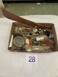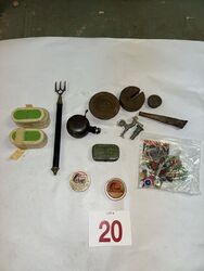 See photos sold as is. Vintage Bicycle bell, vintage bottle stopper, cracker jack charms, toaster fork.