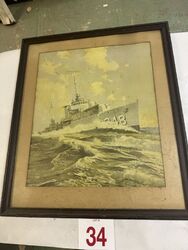 U.S. Battleship signed painting. Needs some restoration, see photos, sold as is