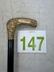 Measuring 35" long, this antique Gentleman's Cane has a 3 1/4" long, hand repousse, gold-filled top. The top is hand engraved,” and beautiful bright-cut scroll and filigree design. This gold-filled top is in original condition with no wear or dents . The ebonized shaft is original and it still retains its original steel ferrule