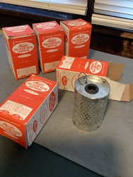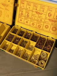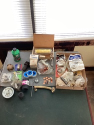 Chrome, polish, Teflon tape, fernco water plug, cane bottom, small engine, new old stock parts, copper brackets, wire wheel, drill bits, and other stuff