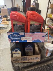 3 quarts 5W-30 synthetic blend oil, 1 quart 5W-40 synthetic oil, 1 quart 0W-20 synthetic oil, 11 quarts 5W-30 Mopar engine oil, 2 quarts 5W – 50 Castrol edge motor oil. 2 Box’s one money