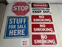 Stop sign, stuff for sale, danger, construction area, and three no smoking signs see photos sold as is