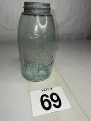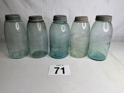 Atlas strong shoulder mason, mason’s Patent Hero cross, Masons improved, and two mason Patent CFJ jars. No chips or cracks. See photos for description sold as is.