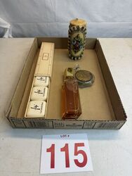 Two perfume bottles, one candle and sample soaps. See photos for description sold as is.