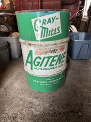 Gray, Mills, Agitene parts cleaning fluid 33 gallon drum. Some rust and tarnish barrel is empty sold as is.