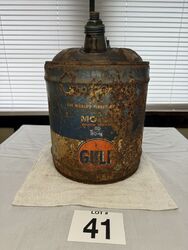 Gulf 5 gallon oil can heavy rust and tarnish. The can is still filled with oil unsure if it’s used oil or new oil sold as is.