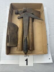 Two roofing hammers, one slate hammer, and one ax head all in used condition sold as is