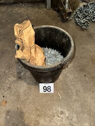 Bucket of roofing nails, 2 gallon bucket, approximately halfway, full one and a half inch nails sold as is