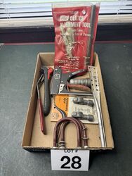 Lisle clutch alignment tool, craftsman stapler, new old stock, side, terminals, muffler, clamps, and other random tools unmarked sold as is