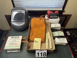 Helmet googles leather apron, and vision lenses. New old stock sold as is