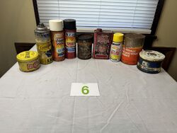 Monkey Link chains new old stock, wolf‘s door ease, scotch electrical, tape, kester paste can, WD-40 bottle, GM gear lubricant with oil, Veedol cardboard can empty with hole on bottom, and Lubriplate. Sold as is