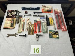 Pipe and tube cutters, brass fittings. Soldering wire, tap and dies, and Aluminum oxide plumbers roll. Sold as is