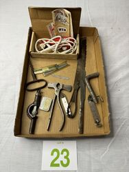 Lisle starter snap ring tool, 2 Milwaukee hex extension random drill bits, chuck key, gauge measure tool, torpedo level. All sold as is