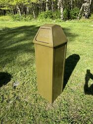 Vintage united metal garbage can shows signs of use 42 inches in height 12” x 12” see photos for description sold as is