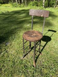 Industrial metal stool has rust and tarnish in good usable condition. See photos for description sold as is.