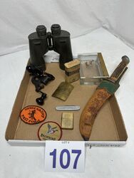 US Army binoculars, vintage shotgun shell, reloader, camel zippo, lighter New Jersey state police school safety patrol badge two hunting patches one trade knife and the other blade knife is a buffalo Skinner made by G. C. C. O. Germany see photos for description sold as is.