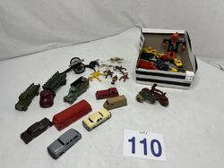 Cast-iron motorcycle police officer with sidecar, Marx toys, Tootsie toys with rubber wheels, old plastic figurines, matchbox lesney. See photos for description sold as is