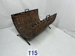 Wicker firewood rack show signs of use 18” x 14” x 12” high. See photos for description sold as is.