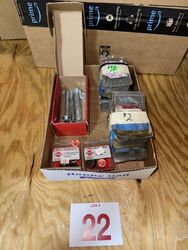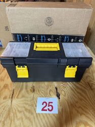 Toolbox with hardware and tools there’s a level in there holesaw tape measure files and drillbits rasp sold as is