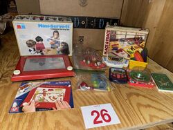 Tupperware toys mini Surfset complete place and trace toys etch a sketch, wooden dolls, handheld toys see photos for description sold as is