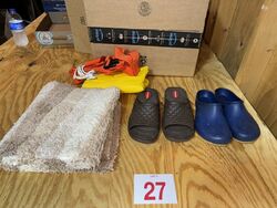 Size 11 men’s size 9 women’s, carpet is approximately 4 x 2, orange strap and rain pants. See photos sold as is.