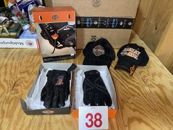 Harley Davidson oil catcher two Harley Davidson snapback hats, two pairs of Harley Davidson gloves one leather one cloth the gloves are women’s gloves see photos sold as is