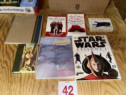 Star Wars book, essential mathematics textbook, the Bible, brand, new notepad, the red hat, Society, books, and the very quiet cricket see photos sold as is
