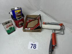 Turpentine, paint, stripper, paint, bucket, sandpaper, and roller handles all in used condition. See photos.