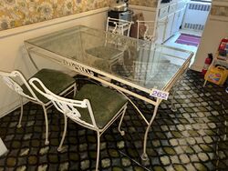 Vintage Wrought Iron Patio Set. No chips or cracks on the glass. 4 chairs & 1 Vase. See photos for condition. Sold as is
